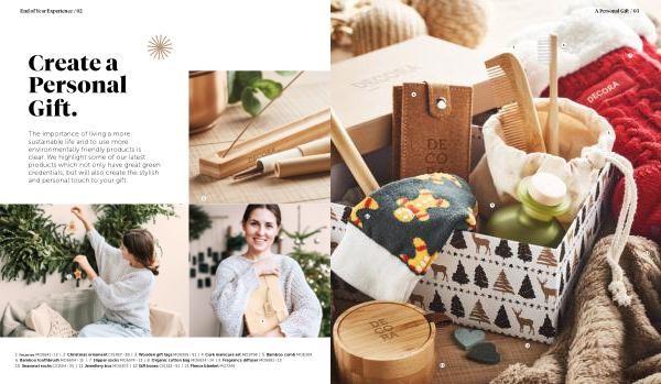 1 . Incense MO6641 › 12 | 2 . Christmas ornament CX1487 › 89 | 3 . Wooden gift tags MO6569 › 91 | 4 . Cork manicure set MO9798 | 5 . Bamboo comb MO6304 6 . Bamboo toothbrush MO6604 › 15 | 7 . Slipper socks MO6574 › 13 | 8 . Organic cotton bag MO6624 › 14 | 9 . Fragrance diffuser MO6681 › 12 10 . Seasonal socks CX1504 › 25 | 11 . Jewellery box MO6303 | 12 Gift boxes CX1513 › 91 | 13 . Fleece blanket MO7246