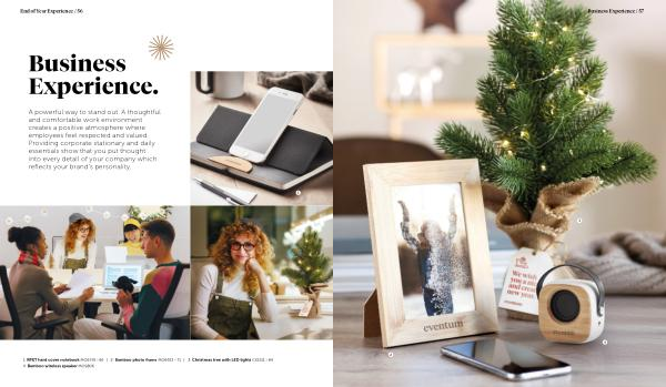 1 . RPET hard cover notebook MO6576 › 66 | 2 . Bamboo photo frame MO6653 › 71 | 3 . Christmas tree with LED lights CX1511 › 84 4 . Bamboo wireless speaker MO9806