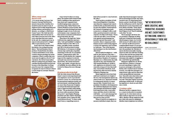 Still , the early returns from the pandemic ’ s remote-work experiment indicate employees can be as productive as before or more . In a survey last year by international employee health care and investment consulting firm Mercer , more than 90 percent of employers said productivity had stayed the same or improved with staff working off-site . “ The productivity of the bank has been really exceptional during this period ,” says Stephen Fleming , president and CEO of River City Bank , and a member of the Comstock ’ s Editorial Advisory Board . “ So there really hasn ’ t been a compelling reason to