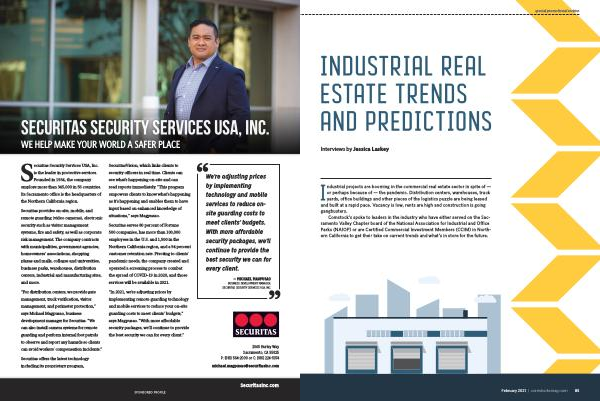 Securitas serves 80 percent of Fortune 500 companies , has more than 100,000 employees in the U . S . and 1,500 in the Northern California region , and a 94 percent customer retention rate . Pivoting to clients ’ pandemic needs , the company created and operated a screening process to combat the spread of COVID-19 in 2020 , and those services will be available in 2021 .