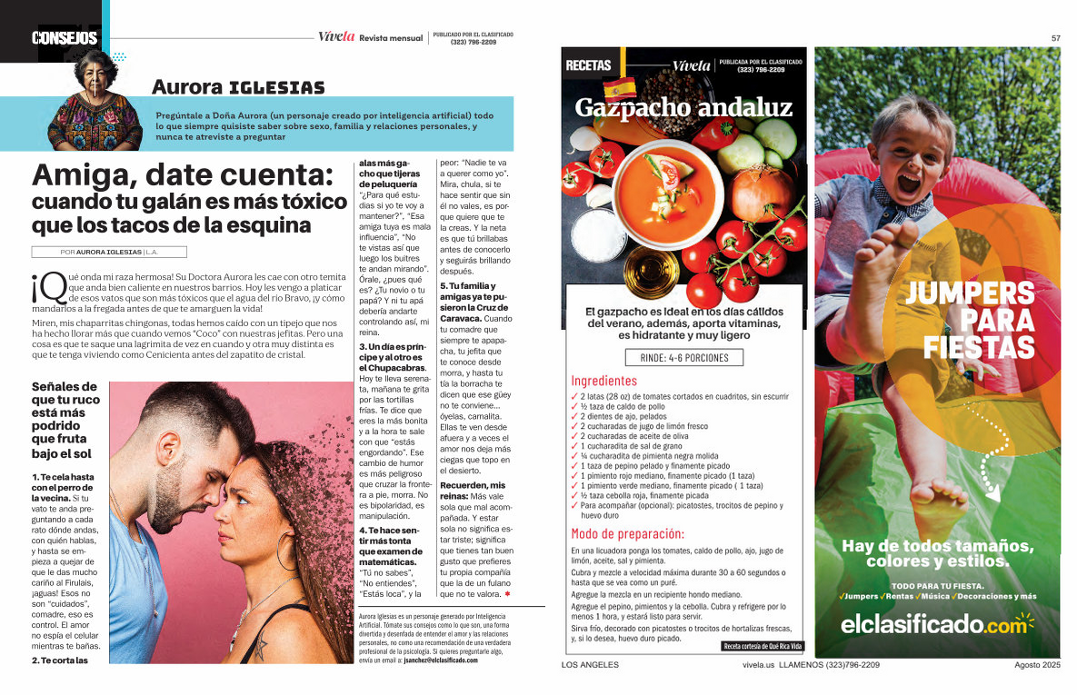 Aurora Iglesias es un personaje generado por Inteligencia Artifi cial. Tómate sus consejos como lo que son, una forma divertida y desenfada de entender el amor y las relaciones personales, no como una recomendación de una verdadera profesional de la psicología. Si quieres preguntarle algo, envía un email a: jsanchez @ elclasificado. com
