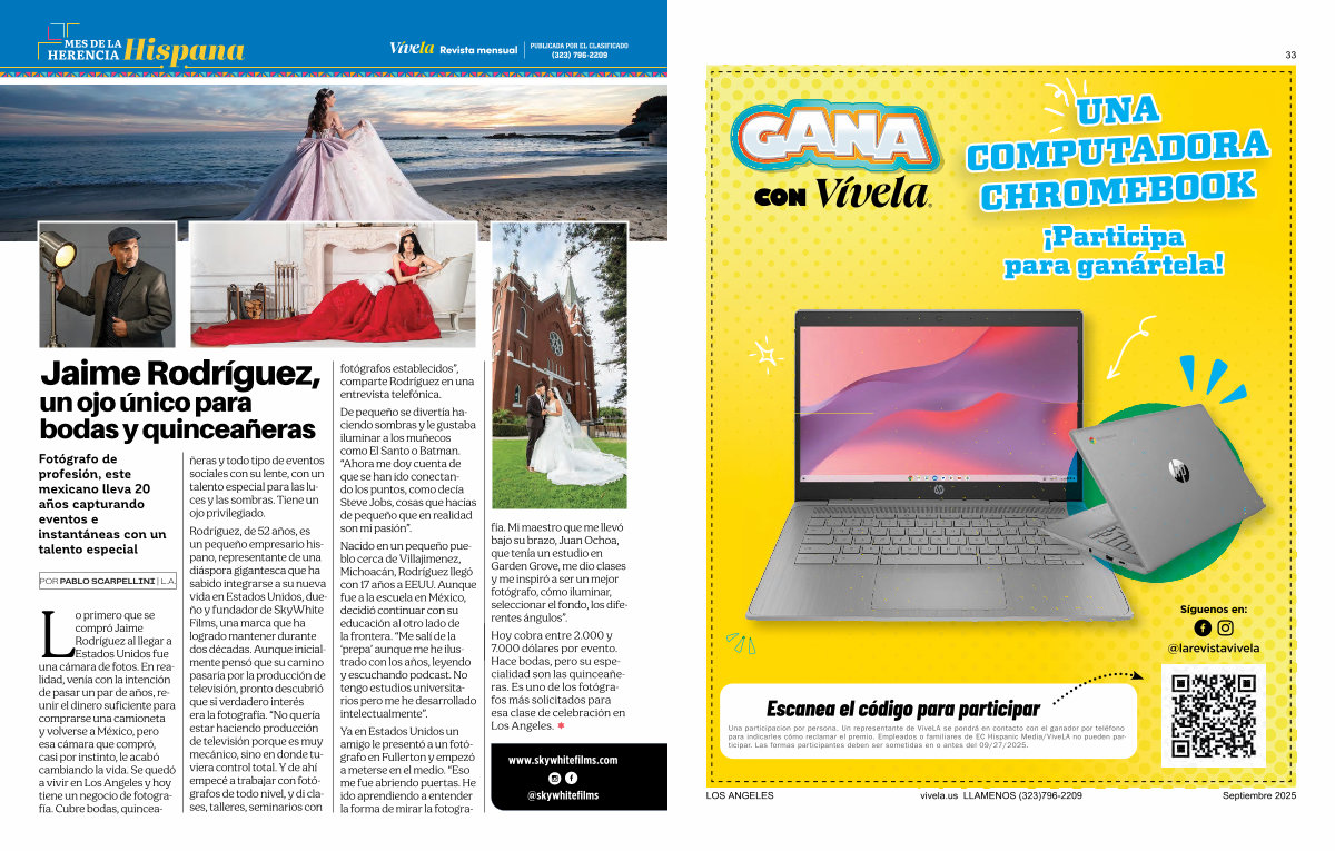 Lo primero que se compró Jaime Rodríguez al llegar a Estados Unidos fue una cámara de fotos. En realidad, venía con la intención de pasar un par de años, reunir el dinero suficiente para comprarse una camioneta y volverse a México, pero esa cámara que compró, casi por instinto, le acabó cambiando la vida. Se quedó a vivir en Los Angeles y hoy tiene un negocio de fotografía. Cubre bodas, quinceafía. Mi maestro que me llevó bajo su brazo, Juan Ochoa, que tenía un estudio en Garden Grove, me dio clases y me inspiró a ser un mejor fotógrafo, cómo iluminar, seleccionar el fondo, los diferentes ángulos”.