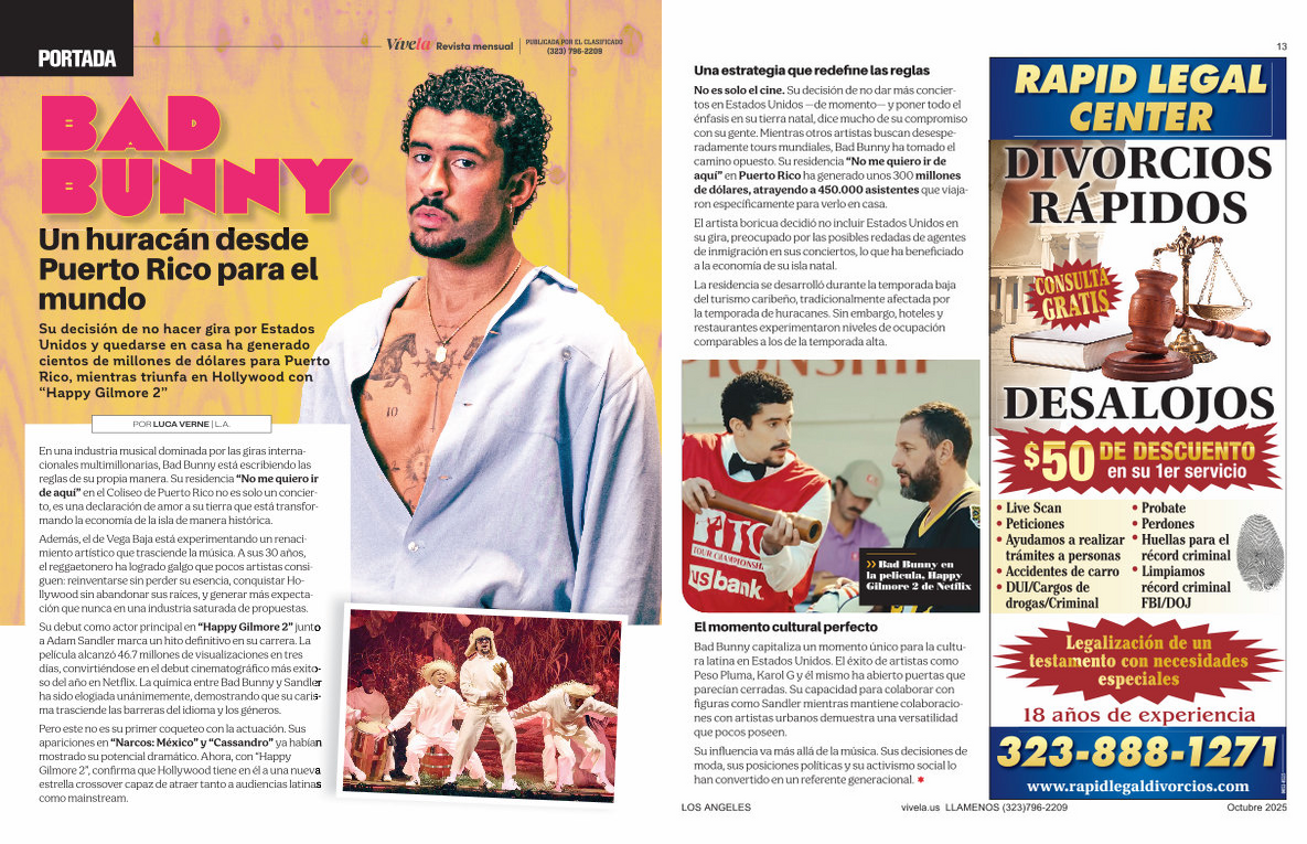 No es solo el cine. Su decisión de no dar más conciertos en Estados Unidos— de momento— y poner todo el énfasis en su tierra natal, dice mucho de su compromiso con su gente. Mientras otros artistas buscan desesperadamente tours mundiales, Bad Bunny ha tomado el camino opuesto. Su residencia“ No me quiero ir de aquí” en Puerto Rico ha generado unos 300 millones de dólares, atrayendo a 450.000 asistentes que viajaron específicamente para verlo en casa.