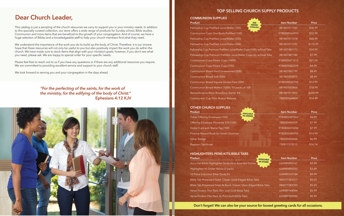 This catalog is just a sampling of the church resources we carry to support you in your ministry needs. In addition to this specially curated collection, our store offers a wide range of products for Sunday school, Bible studies, Communion and more items that are beneficial to the growth of your congregation. And of course, we have a huge selection of Bibles and a knowledgeable staff to help your church members find what they need.