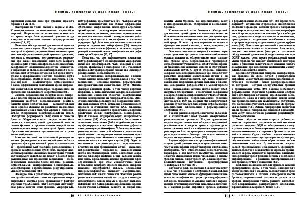 Многочисленные экспериментальные и клинические данные позволяют сделать вывод о том, что воспаление – основная причина формирования гиперреактивности дыхательных путей. Многие факторы внешней среды, в том числе вирусная инфекция, а также ингаляции аллергена вызывают воспаление слизистой оболочки воздухоносных путей и одновременно их гиперреактивность. Существенно значима роль вирусов в повреждении эпителия дыхательных путей, активации воспалительного процесса и стимуляции синтеза БАВ. Указанные процессы сопровождаются привлечением вирусами различных клеток( нейтрофилов, эозинофилов, тучных клеток), поддерживающих аллергическое воспаление [ 31 ]. Отек, связанный с биологически активными веществами( БАВ), подобными гистамину, формируется вследствие образования дефектов в микроваскулярной мембране. У больных отмечено усиление отека слизистой оболочки дыхательных путей ночью с последующим возникновением приступов удушья, что объясняется изменением гормонального статуса в это время суток [ 32 ]. Один из механизмов микроваскулярного просачивания, в частности, при бронхиальной астме, – вызванное нейропептидами сокращение эндотелиальных клеток посткапиллярных венул, способных сокращаться благодаря наличию в них волокон актина и миозина. Просачивание плазмы происходит через образующиеся при этом межклеточные щели и базальную мембрану. Просочившаяся в интерстициальное пространство плазма, обладающая гиперосмолярностью, вызывает « сморщивание » эпителиальных клеток слизистой оболочки, расширение межклеточных щелей, что создает условия для последующего выхода плазмы в просвет дыхательных путей [ 33 ]. Одновременно происходит секреция биологически активных веществ и сокращение