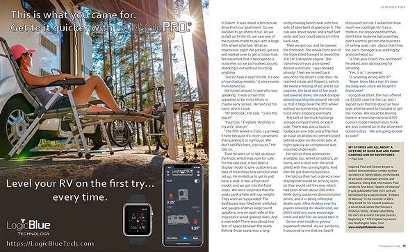REMEMBER WHEN in Salem . It was about a ten-minute drive from our apartment . So , we decided to go check it out . As we pulled up to the lot , we saw one of the custom-made trucks with a large fifth wheel attached . What an impressive sight ! We parked , got out , and walked over to get a closer look . We assumed that it belonged to a customer , so we just walked around checking it out without touching anything .