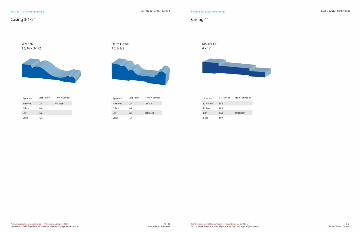 Profile images are not to exact scale- Prices shown are per 100 LF 2022 Millwork Sales Royal Palm. All prices are subject to change without notice.
