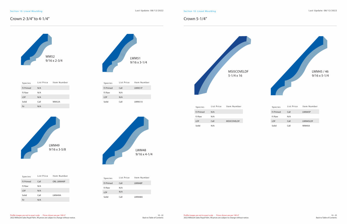 Profile images are not to exact scale- Prices shown are per 100 LF 2022 Millwork Sales Royal Palm. All prices are subject to change without notice.