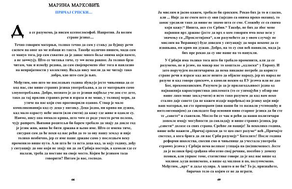 У Србији има толико тога што би требало променити , али да се разумемо , не и језик , па макар нас то коштало „ одласка “ у Европу . И зато поручујем политичарима да нема никакве потребе да користе стране речи и изразе кад желе нешто да објасне народу , јер их народ не разуме и кад говоре српским , а камоли неким од ЕУ језика или не дао Бог , прекоокеанским . Разумем ја да је прилагодљивост једна од најважнија карактеристика дипломата ( то се узимајући у обзир ове наше лако може закључити ) и исто тако разумем да кад вам неко стално даје савете ( да не кажем издаје наређења ) на језику који није ваш матерњи , ви сте приморани ( ови наши би то назвали учтивошћу и интелигенцијом ) да савладате бар основни ниво старног језика да би сте те „ савете “ и схавтили . Могло би се чак и рећи да наши политичари донекле имају могућности да савладају и више страних језика , јер „ савети “ долазе са свих страна . Срећне ли нације ! За неколико година , више неће важити „ Причај српски да те цео свет разуме “ већ „ Причајте светске , а кога брига да ли вас Срби разумеју “ Баталите ! После година реформи школства , свесни смо и чињенице да учестала употреба страних језика у Србији нема великог утицаја на ( не ) писменост . Јесте да је велики број грађана обогатио свој речник , посебно у домену псовки , али упркос томе , статистике говоре да је код нас више од милион људи неписмено , а више од милион и по , полуписмено . Међутим , „ врх “ и даље кулира . А зашто и не би ? То је , признаћете , бирачко тело са којим се не да играти .