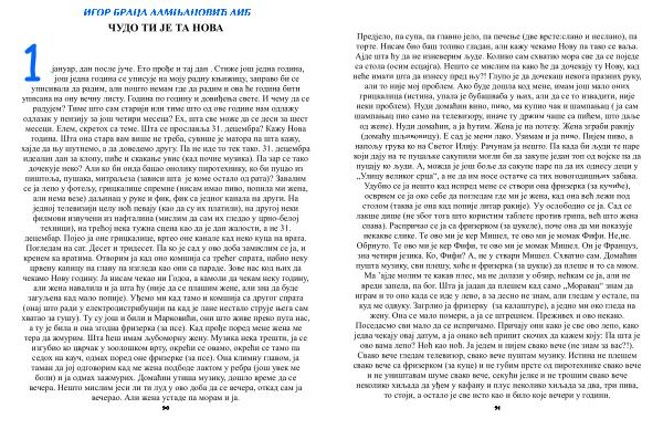 . јануар , дан после јуче . Ето прође и тај дан . Стиже још једна година , још једна година се уписује на моју радну књижицу , заправо би се уписивала да радим , али пошто немам где да радим и ова ће година бити уписана на ону вечну листу . Година по годину и довиђења свете . И чему да се радујем ? Тиме што сам старији или тиме што од ове године нам одлажу одлазак у пензију за још четири месеца ? Ех , шта све може да се деси за шест месеци . Елем , скретох са теме . Шта се прославља 31 . децембра ? Кажу Нова година . Шта она стара вам више не треба , сувише је матора па шта кажу , хајде да њу шутнемо , а да доведемо другу . Па не иде то тек тако . 31 . децембра идеалан дан за клопу , пиће и скакање увис ( кад почне музика ). Па зар се тако дочекује неко ? Али ко би онда бацао онолику пиротехнику , ко би пуцао из пиштоља , пушака , митраљеза ( зависи шта је коме остало од рата )? Завалим се ја лепо у фотељу , грицкалице спремне ( нисам имао пиво , попила ми жена , али нема везе ) даљинац у руке и фик , фик са једног канала на други . На једној телевизији целу ноћ певају ( као да су их платили ), на другој неки филмови извучени из нафталина ( мислим да сам их гледао у црно-белој техници ), на трећој нека тужна сцена као да је дан жалости , а не 31 . децембар . Појео ја оне грицкалице , вртео оне канале кад неко куца на врата . Погледам на сат . Десет и тридесет . Па ко је сад у ово доба замислим се ја , и кренем ка вратима . Отворим ја кад оно комшија са трећег спрата , набио неку црвену капицу на главу па изгледа као они са параде . Зове нас код њих да чекамо Нову годину . Ја нисам чекао ни Годоа , а камоли да чекам неку годину , али жена навалила и ја шта ћу ( није да се плашим жене , али зна да буде загуљена кад мало попије ). Уђемо ми кад тамо и комшија са другог спрата ( онај што ради у електродистрибуцији па кад је лане нестало струје њега сам хватао за гушу ). Ту су још и били и Марковићи , они што живе преко пута нас , а ту је била и она згодна фризерка ( за псе ). Кад прође поред мене жена ме тера да жмурим . Шта ћеш имам љубоморну жену . Музика нека трешти , ја се изгубио ко цврчак у зоолошком врту , окрећи се овамо , окрећи се тамо па седох на кауч , одмах поред оне фризерке ( за псе ). Она климну главом , ја таман да јој одговорим кад ме жена подбоде лактом у ребра ( још увек ме боли ) и ја одмах зажмурих . Домаћин утиша музику , дошло време да се вечера . Нешто мислим јеси ли ти луд у ово доба да се вечера , откад сам ја вечерао . Али жена устаде па морам и ја .
