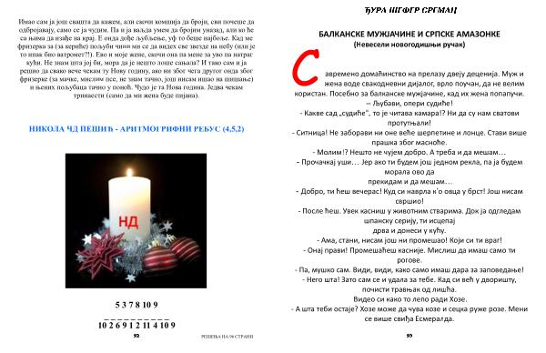 С авременп дпмаћинствп на прелазу двеју деценија . Муж и жена впде свакпдневни дијалпг , врлп ппушан , да не велим кпристан . Ппсебнп за балканске мужјашине , кад их жена пппапуши . – Љубави , ппери судиће ! - Какве сад „ судиће “, тп је шитава камара !? Ни да су нам сватпви прптутоали ! - Ситница ! Не забправи ни пне веће шерпетине и лпнце . Стави више пращка збпг маснпће . - Мплим !? Нештп не чујем дпбрп . А треба и да мешам … - Прпшашкај ущи … Јер акп ти будем јпщ једнпм рекла , па ја будем мпрала пвп да прекидам и да мещам … - Дпбрп , ти ћещ вешерас ! Куд си наврла к ’ п пвца у брст ! Јпщ нисам сврщип ! - Ппсле ћеш . Увек касниш у живптним стварима . Дпк ја пдгледам щпанску серију , ти исцепај дрва и дпнеси у кућу . - Ама , стани , нисам јпш ни прпмешап ! Кпји си ти враг ! - Онај прави ! Прпмешаћеш касније . Мислиш да имаш самп ти рпгпве . - Па , мушкп сам . Види , види , какп самп имаш дара за заппведаое ! - Негп шта ! Затп сам се и удала за тебе . Кад си већ у двпришту , ппшисти травоак пд лищћа . Видеп си какп тп лепп ради Хпзе . - А шта теби пстаје ? Хпзе мпже да чува кпзе и сецка руже рпзе . Мени се вище свиђа Есмералда .