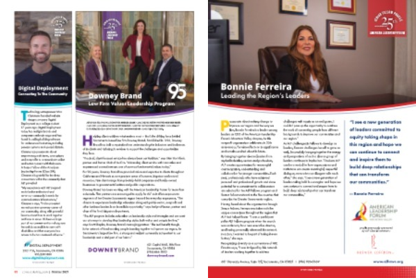 Helping clients achieve what matters most — that ’ s the driving force behind Sacramento-based law firm Downey Brand . Established in 1926 , Downey Brand has built a reputation from understanding the industries and businesses of its clients and tailoring its services to support the challenges and opportunities they face . “ Practical , client-focused service has always been our tradition ,” says Stan Van Vleck , partner and former chair of the firm . “ Advancing client service with innovative and experienced counsel remains one of our most fundamental values today .” For 95-years , Downey Brand has provided vision and expertise to clients throughout California and Nevada in core practice areas of business , litigation and natural resources . Firm clients range from privately-held companies and family-owned businesses to governmental entities and public corporations . Downey Brand has been working with the American Leadership Forum for more than a decade . Firm partners are encouraged to apply for ALF as it offers exposure to segments of the Greater Sacramento region beyond the everyday experience . “ The chance to experience leadership education along with public-sector , nonprofit and other business leaders is an incredible opportunity ,” says Janlynn Fleener , partner and chair of the firm ’ s litigation department . “ The ALF program includes education on leadership style and strategies and we want our attorneys to develop their leadership styles both within and outside the firm ,” says Scott Shapiro , Downey Brand ’ s managing partner . “ The real benefit , though , is the network of hard-working people banding together to improve our region . As Sacramento ’ s largest law firm , a strong and resilient community is important to our leadership and a vital part of our fabric .”
