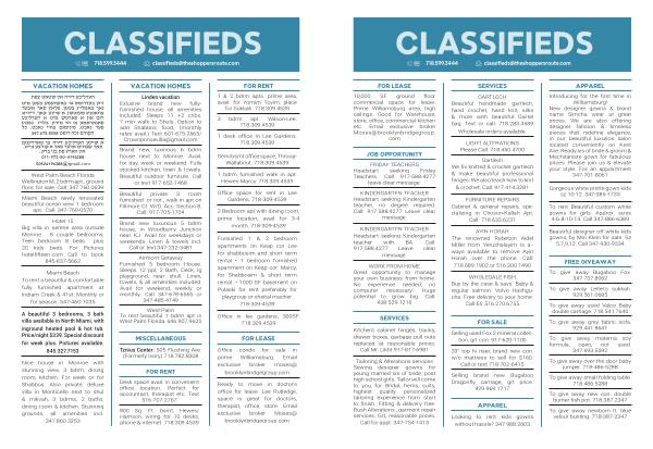 Furnished 1 & 2 bedroom apartments on Keap cor Lee for shabbosim and short term rental • 1 bedroom furnished apartment on Keap cor . Marcy , for Shabbosim & short term rental . • 1000 SF basement on Pulaski for rent preferably for playgroup or sheital macher . 718-309-4539