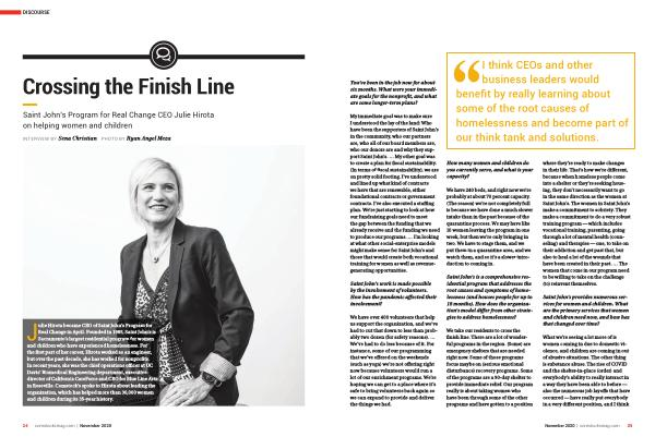 My immediate goal was to make sure I understood the lay of the land : Who have been the supporters of Saint John ’ s in the community , who our partners are , who all of our board members are , who our donors are and why they support Saint John ’ s . … My other goal was to create a plan for fiscal sustainability . ( In terms of fiscal sustainability ), we are on pretty solid footing . I ’ ve understood and lined up what kind of contracts we have that are renewable , either foundational contracts or government contracts . I ’ ve also executed a staffing plan . We ’ re just starting to look at how our fundraising goals need to meet the gap between the funding that we already receive and the funding we need to produce our programs . … I ’ m looking at what other social-enterprise models might make sense for Saint John ’ s and those that would create both vocational training for women as well as revenuegenerating opportunities .