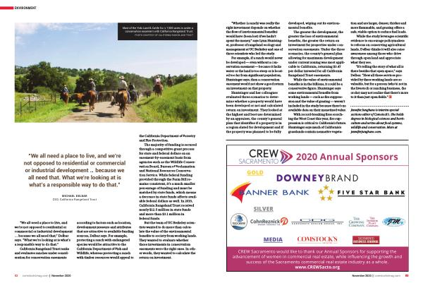The greater the development , the greater the loss of environmental benefits , the greater the return on investment for properties under conservation easements . Under the three scenarios , the county ’ s general plan allowing for maximum development under current zoning was most applicable to California , returning $ 3.47 per dollar invested for all California Rangeland Trust easements .