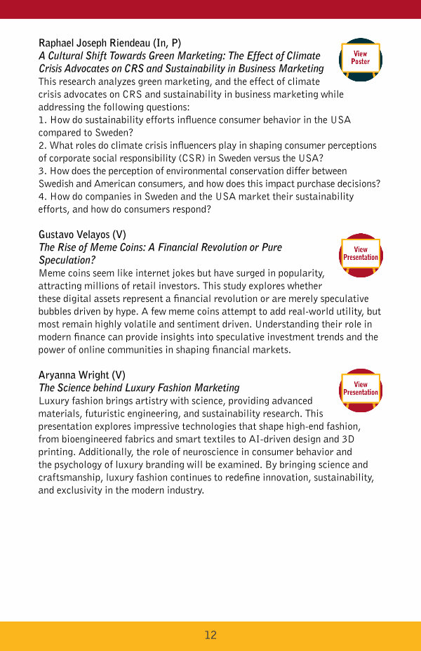 Aryanna Wright( V) The Science behind Luxury Fashion Marketing Luxury fashion brings artistry with science, providing advanced materials, futuristic engineering, and sustainability research. This presentation explores impressive technologies that shape high-end fashion, from bioengineered fabrics and smart textiles to AI-driven design and 3D printing. Additionally, the role of neuroscience in consumer behavior and the psychology of luxury branding will be examined. By bringing science and craftsmanship, luxury fashion continues to redefine innovation, sustainability, and exclusivity in the modern industry.