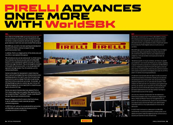 Desde 2004, la asociación entre Pirelli y WorldSBK ha crecido y florecido gracias al proceso de desarrollo constante llevado a cabo en el seno de la competición más avanzada para motos derivadas de serie, cuyo resultado ha sido un importante avance en los productos Pirelli dirigidos tanto al circuito como a la carretera.