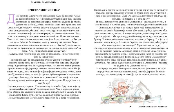 Наиме , он је заиста умео са људима и то све док су му ти исти људи требали , док му деца нису отишла на буџет , прво као студенти , а сада и као службеници . Сада му , међутим , не требају ни људи ни пиљара , ни месара , а и шта ће му ? И ето ... Захваљујући свим тим „ митовима “, задовољни су сви , и моје комшија и њихова деца , јер имају папир да су интелектуалци , ( а папир , као и увек и за свагда , трпи све ) а и професори се задовољно смеју . Једнима је мерак због нових зуба , а другима због увек свежег меса , ваљда . А тако изнедрени „ интелектуалци “ данас претендују на ... Ма претендују на било коју фотељу , само да су на буџету . И тако одваљени и заваљени , воде нас у Европу . Е које су то легенде , кажем вам ја . А та иста Европа , нас замислите неће управо због наше српске „ митологије “. Мрзе нас , па то ти је . И ето шта ја данас поред све моје муке и главобоље доживљавам , не би ли доживео пензију . Али како ствари стоје све ми се чини да пензија неће да доживи мене . Предузећа више нема да плаћају као што су некада , па нема ни фондова , али зато нам је „ митологија “ богатија него икад . Легенди данас има на свим нивоима и у свим службама . Јер данас једино ако имате удела у „ митовима “ можете да радите и да „ заврште пос ' о “. И на крају , кад мало боље размислим , можда је и много да се је поред толиких легенди надам каквој пензији , јер шта ће мени пензија , кад имам душу . А каква је криза , не може се имати све .