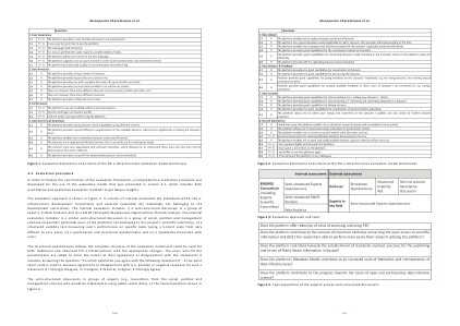 The evaluation approach is shown in Figure 3. It consists of internal evaluation( by individuals within the e‐ infrastructure development consortium) and external evaluation( by individuals not belonging to the development consortium). The internal evaluation includes: i) a semi‐structured discussion in a group of experts, ii) Web Analytics and iii) a SWOT( Strengths‐Weaknesses‐Opportunities‐Threats) analysis. The external evaluation includes: i) a similar semi‐structured discussion in a group of social, political and management sciences researchers( potential users of the platform) not belonging to the project’ s scientific committee, ii) a structured usability test measuring user’ s performance on specific tasks( using a 5‐Likert scale from very difficult to very easy), iii) a quantitative and structured questionnaire and iv) a Qualitative Discussion with users.