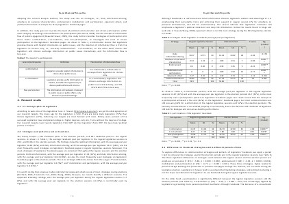 We totally analyze 1,526 Facebook posts in the election periods, and 897 Facebook posts in the regular sessions. As shown in Table 3, the average Facebook post per legislator in the regular legislative sessions is 29.9, and 50.86 in the election periods. The findings show that political information, with the average post per legislator 16.83( 56 %), and daily information sharing, with the average post per legislator 10.17( 34 %), are the most frequently used strategies on legislators’ Facebook pages in regular legislative sessions. Moreover, the main strategies of legislators ' Facebook pages are consistent throughout the regular sessions and the election periods. Political information, with the average post per legislator 17.33( 34 %), and daily information sharing, with the average post per legislator 14.23( 28 %), are also the most frequently used strategies on legislators’ Facebook pages in the election periods. The main strategic difference comes from the usage of“ endorsement, with the average post per legislator 4.3( 9 %)” and“ mobilization and participation, with the average post per legislator 6.8( 13 %).”