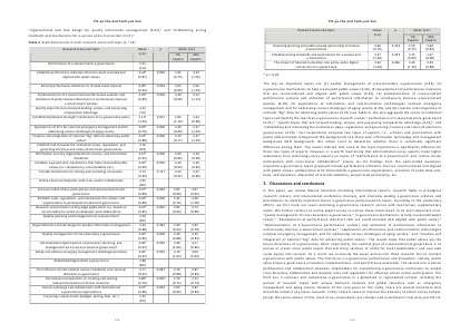 The top six important topics are( 1) quality management of cross‐boundary e‐governance( 4.46),( 2) e‐governance mechanisms to help create / add public values( 4.40),( 3) development of performance indicators that are result‐oriented and aligned with public values( 4.34),( 4) implementation of e‐Government performance systems and utilization of performance information to continuously improve e‐Government policies( 4.29),( 5) applications of information and communication technologies national emergency management and for addressing various challenges of aging society( 4.29), and( 6) creation and integration of national“ big” data for advancing public values( 4.23)( see Table 2). We also aggregate the scores of individual topics and identify the top three e‐governance research arenas:“ performance of e‐Government / e‐governance( 4.21),”“ specify topics that are forward‐looking, unique, and possessing comparative advantage( 4.21),” and“ establishing and innovating the institutions( laws, regulations, and governing structure and rules) of electronic governances( 4.10).” Our respondents compose two types of experts, i. e., scholars and practitioners with public administration background( PA background) and those with information technology and management background( MIS background). We utilize t‐test to determine whether there is statistically significant difference among them. The results indicate that none of the topic importance is significantly different for these two types of experts. However, it is worth mentioning that administration‐savvy experts make higher evaluations than technology‐savvy experts on topics of“ performance of e‐Government” and“ online citizen participation with cross‐sector collaboration” arenas. As for findings from the open‐ended questions, important e‐governance topics proposed include performance indicators that are result‐oriented and aligned with public values, collaboration with international e‐governance organizations, provision of pubic data sets, tools, and education, alleviation of internet addiction, joined cloud partnership, etc.