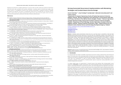 Abstract: In Thailand, several e‐Government services have not as yet been active or sustainable as they have been developed without taking customer experiences or the value chain into consideration. However, recent progress in the field of services design and innovation has resulted in deployment of e‐Government implementation. Moreover, in order to achieve better e‐services, shared services with seamless connections across enterprises are also needed, i. e. connected government. In this paper, we target these shortcomings by reviewing the lessons learned in previous e‐Service implementation. Four of these lessons focus on: understanding the core business and the service context, building stakeholder capacity, especially service design for their own businesses, engaging multi‐sectors for service co‐creation with customer experiences, and setting up an investment scheme with marketing strategies for providing sustainable services Based on these learned lessons, we propose a method of driving connected government in designing context‐aware services, and managing and stimulating widespread adoption of e‐services by using benefits realization as a marketing strategy. A project initiative called Coop‐Cyber‐Brain, a platform of community knowledge sharing and services in the agriculture domain, has been implemented for evaluating the model and harvesting best‐practices in connected Government transformation.