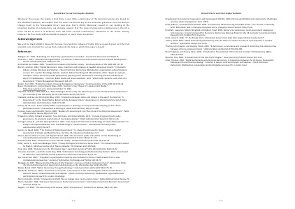 Gibson, Rachel, Wainer Lusoli, and Stephen Ward. 2008.“ The Australian public and politics on‐line: Reinforcing or reinventing representation?” Australian Journal of Political Science 43( 1): 111‐131. Gronlund, Ake. 2001.“ Democracy in an IT‐framed society.” Communications of the ACM. 44( 1): 23‐26 Hiller, Janine S., and France Belanger. 2001.“ Privacy Strategies for Electronic Government.” In E‐Government 2001, edited by Mark A. Abramson and Grady E. Means. Boulder, CO: Rowman and Littlefield. King, Julie. 2006.“ Democracy in the Information Age.” Australian Journal of Public Administration 65( 2): 16‐32. Kraemer, Kenneth L, and John Leslie King. 2006.“ Information Technology and Administrative Reform: Will E‐Government be different?” International Journal of Electronic Government Research 2( 1): 1‐20. Lyu, Hyeon‐Suk. 2007.“ The public’ s e‐participation capacity and motivation in Korea: A web analysis from a new institutionalist perspective.” Journal of Information Technology and Politics 4( 4): 65‐79. Medaglia, R. 2007.“ Measuring the diffusion of eParticipation: A survey on Italian local government.” Information Polity: