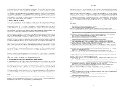 However, we emphasize that the indicator sets should include more criteria than those that the existing evaluations are based on. We furthermore claim that these evaluations should be supplemented with other types of testing in order to get a more comprehensive picture of a web site. The experiences from such testing can then be used to further develop these indicator sets. Usability tests of a few of the evaluated websites would give valuable feedback to the development of indicators. User surveys and surveys to those responsible for the work with the websites are also valuable methods that can give a richer picture and complement the overall quality issue. Finally there is need for more research where several methods are combined. This paper has suggested some of the reasons for the observed differences in quality of municipality websites. But the paper has also shown that this difference is not perceived by the real users of the websites. There is a need to combine heuristic methods( expert evaluations), usability tests, and user surveys to try to find a link between these.