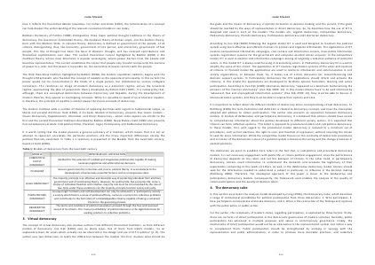 the goals and the means of democracy, if opinion formation or decision making; and the second, if the goals should be reached by the ways of representative or direct democracy. So, he describes how the use of ICT is designed and used in each of the models. The models are: Legalist democracy, Competitive democracy, Plebiscitary democracy, Pluralist democracy, Participatory democracy and Libertarian democracy.