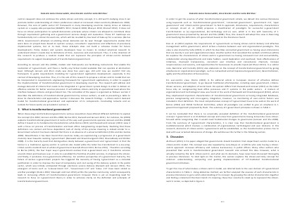 Dais et. al( 2012) explains the requirements of t‐government as having citizen‐centric delivery and effective management within government, which strikes a balance between user and organizational paradigms. This view is also shared by Saha( 2010), in which he describes connected government as having seven dimensions that are mostly in user and organizational views. Another author that seconded this outlook is Al Khouri( 2011). He explains the characteristics of citizen‐centric e‐government as having increased trust and accountability, collaboration among departments and stake holders, avoid duplication and overhead, track effectiveness of initiatives, improved transparency, consistent user interface and convenience channels, increase responsiveness and security, and opportunities for businesses to provide inputs( Al Khouri 2011). In a similar note, Bannister and Connolly( 2011) also elaborate on the concept of transformational government by giving emphasize on organizational paradigm, such as networked and entrepreneurial government, decentralization, agility and the elimination of bureaucracy.