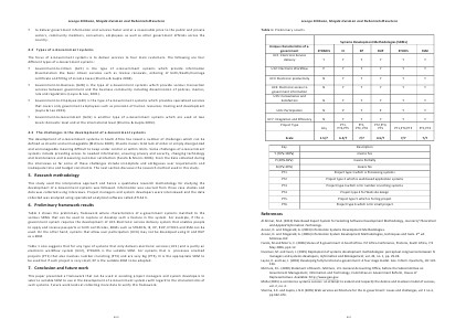 Table 1 shows the preliminary framework where characteristics of e‐government systems matched to the various SDMs that can be used to capture or develop such a feature in the system. For example, if the e‐ government system requires the development of UC1‐Electronic service delivery system that enables people to apply and receive passports or birth certificates, SDMs such as STRADIS, IE, XP, RUP, ETHICS and SSM can be used. On the other hand, systems that allow user participation( UC6) may not be developed using IE and RUP as a SDM.