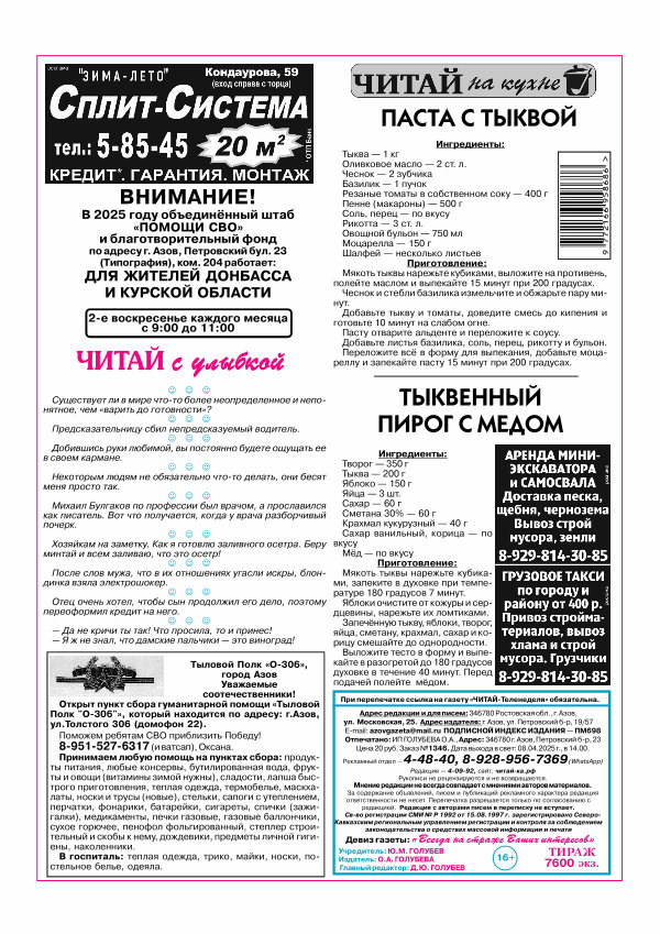 Адрес редакции и для писем: 346780 Ростовская обл., г. Азов, ул. Московская, 25. Адрес издателя: г. Азов, ул. Петровский б-р, 19 / 57 E-mail: azovgazeta @ mail. ru ПОДПИСНОЙ ИНДЕКС ИЗДАНИЯ— ПМ698 Отпечатано: ИП ГОЛУБЕВА О. А., Адрес: 346780 г. Азов, Петровский б-р, 23 Цена 20 руб. Заказ № 1346. Дата выхода в свет: 08.04.2025 г., в 14.00.