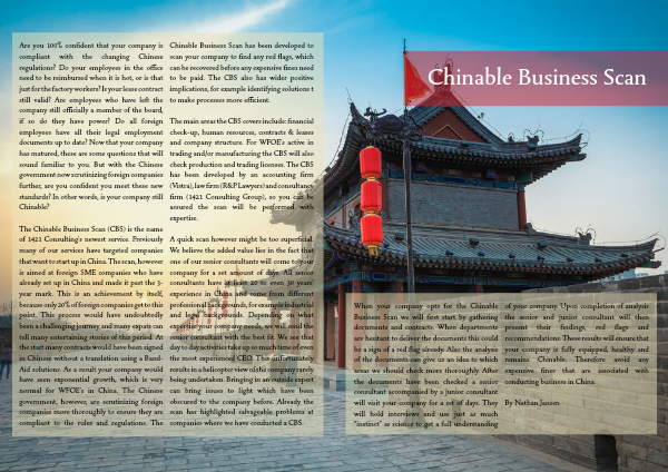 The Chinable Business Scan (CBS) is the name of 1421 Consulting’s newest service. Previously many of our services have targeted companies that want to start up in China. The scan, however is aimed at foreign SME companies who have already set up in China and made it past the 3-year mark. This is an achievement by itself, because only 20% of foreign companies get to this point. This process would have undoubtedly been a challenging journey and many expats can tell many entertaining stories of this period. At the start many contracts would have been signed in Chinese without a translation using a Band-Aid solutions. As a result your company would have seen exponential growth, which is very normal for WFOE’s in China. The Chinese government, however, are scrutinizing foreign companies more thoroughly to ensure they are compliant to the rules and regulations. The Chinable Business Scan has been developed to scan your company to find any red flags, which can be recovered before any expensive fines need to be paid. The CBS also has wider positive implications, for example identifying solutions t to make processes more efficient.