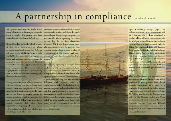 1421 Consulting Group (1421), in collaboration with Vistra Group (Vistra) and R&P Lawyers (R&P), have developed a product which will assist companies to gain knowledge which could determine the future sustainability of a foreign owned entity in China. This service, called Chinable Business Scan, is a scan looking into all details of your Chinese entity. Are your labor contracts in order? Do you operate within your business scope? Are all you taxes filed properly? Do you have any HR issues? Have any rules and regulations changed within the field you operate? Such a check will give you valuable insights