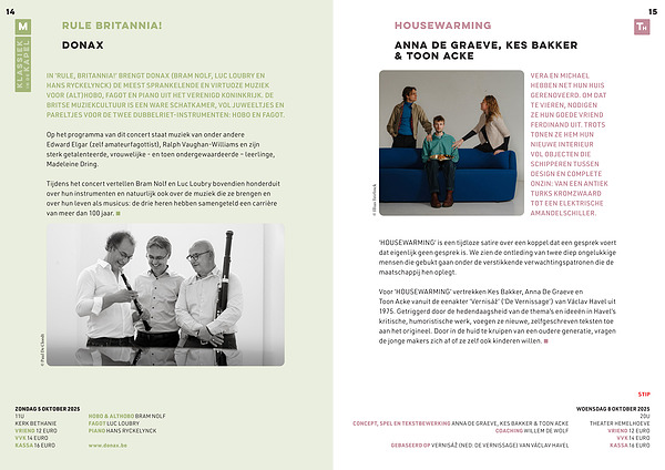 Voor‘ HOUSEWARMING’ vertrekken Kes Bakker, Anna De Graeve en Toon Acke vanuit de eenakter‘ Vernisáž’(‘ De Vernissage’) van Václav Havel uit 1975. Getriggerd door de hedendaagsheid van de thema’ s en ideeën in Havel’ s kritische, humoristische werk, voegen ze nieuwe, zelfgeschreven teksten toe aan het origineel. Door in de huid te kruipen van een oudere generatie, vragen de jonge makers zich af of ze zelf ook kinderen willen.