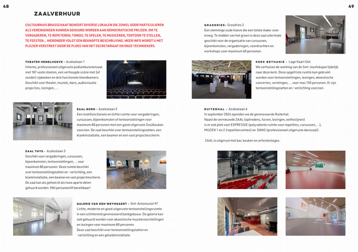 CULTUURHUIS BRASSCHAAT BEHEERT DIVERSE LOKALEN DIE ZOWEL DOOR PARTICULIEREN ALS VERENIGINGEN KUNNEN GEHUURD WORDEN AAN DEMOCRATISCHE PRIJZEN. OM TE VERGADEREN, TE REPETEREN, TONEEL TE SPELEN, TE MUSICEREN, TENTOON TE STELLEN, TE FEESTEN … HIERONDER VOLGT EEN BEKNOPTE BESCHRIJVING. MEER INFO WORDT U MET PLEZIER VERSTREKT DOOR DE PLOEG VAN HET SECRETARIAAT EN ONZE TECHNIEKERS.