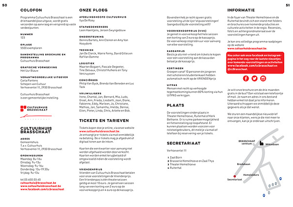 Programma Cultuurhuis Brasschaat is een driemaandelijkse uitgave, wordt gratis verzonden op aanvraag en verspreid op vaste verdeelpunten.