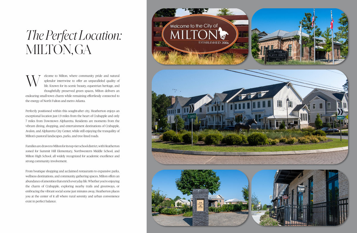 Perfectly positioned within this sought-after city, Heatherton enjoys an exceptional location just 1.9 miles from the heart of Crabapple and only 7 miles from Downtown Alpharetta. Residents are moments from the vibrant dining, shopping, and entertainment destinations of Crabapple, Avalon, and Alpharetta City Center, while still enjoying the tranquility of Milton’ s pastoral landscapes, parks, and tree-lined roads.