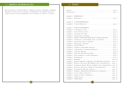 Capítulo 3- GUIA DO ILUSTRADOR Capítulo 3- O Princípio da Vida......................................................... pag. 5 Capítulo 3- Com Um Pé nas Artes...................................................... pag. 5 Capítulo 3- Nivelando Por Cima........................................................ pag. 5 Capítulo 3- Do Iniciante ao Estrelato................................................... pag. 6 Capítulo 3- Primeiro e Fundamental Mandamento do Ilustrador Iniciante.......... pag. 6 Capítulo 3- Já Preparei o meu Portfolio. Posso ir em Frente?.................. pag. 6 Capítulo 3- Existe Vida Antes do Portfolio?.......................................... pag. 6 Capítulo 3- Preparando o Portfolio..................................................... pag. 7 Capítulo 3- Pecado Mortal................................................................ pag. 7 Capítulo 3- Cuidado com Portfolio Folclórico....................................... pag. 7 Capítulo 3- A Importância da Primeira Ilustração................................. pag. 8 Capítulo 3- Uma Dica Bacana........................................................... pag. 9 Capítulo 3- Uma Dica Mais Bacana Ainda.......................................... pag. 9 Capítulo 3- Peças Polêmicas e Outras Esquisitices................................ pag. 9 Capítulo 3- E Finalmente:.................................................................. pag. 9 Capítulo 3- Resumindo....................................................................... pag. 10 Capítulo 3- Durante a Entrevista: Comporte-se. Você Está Sendo Observado.... pag. 11 Capítulo 3- Mostrei a Pasta para Todo Mundo e não Conseguí Nada.... pag. 11 Capítulo 3- Continuo na Mesma, Mostrei o Portfolio e Não Conseguí Nada.. pag. 12 Capítulo 3- Há Coisas Que Não se Esquece, Seja Profissional.............. pag. 12 Capítulo 3- Conseguí Um Trabalho. E Agora?..................................... pag. 13 Capítulo 3- Segundo e Fundamental Mandamento do Ilustrador............ pag. 14 Capítulo 3- E com o Resto do Pessoal?............................................... pag. 15 Capítulo 3- Anuários e Livros de Ilustração.......................................... pag. 15 Capítulo 3- Cultura Geral.................................................................. pag. 15 Capítulo 3- Cultura Inútil................................................................... pag. 16