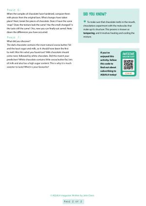 Whenthesamplesofchocolatehavehardened , comparethem withpiecesfrom theoriginalbars . Whatchangeshavetaken place ? Next , breakthepiecesofchocolate . Doesithavethesame ‘ snap ’? Doesthetexturelookthesame ? Hasthesmelchanged ? Is thetastestilthesame ?( Yes , nowyoucan�nalyeatsome !) Note downthedifferencesyouhaveoccured .