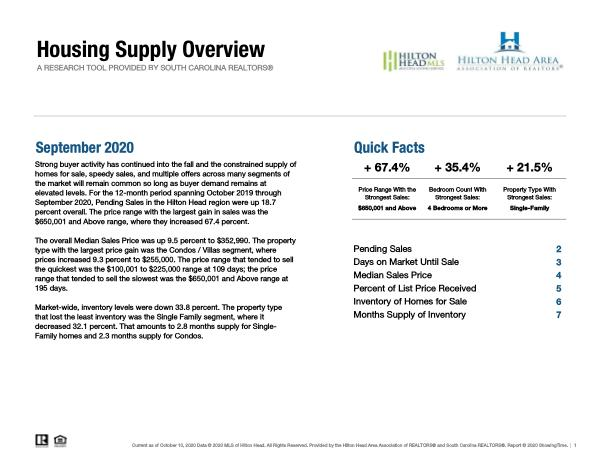 Strong buyer activity has continued into the fall and the constrained supply of homes for sale , speedy sales , and multiple offers across many segments of the market will remain common so long as buyer demand remains at elevated levels . For the 12-month period spanning October 2019 through September 2020 , Pending Sales in the Hilton Head region were up 18.7 percent overall . The price range with the largest gain in sales was the $ 650,001 and Above range , where they increased 67.4 percent .