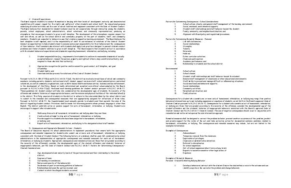 D. Consequences and Appropriate Remedial Actions – Students The Board of Education requires its school administrators to implement procedures that ensure both the appropriate consequences and remedial responses for students who commit one or more acts of harassment, intimidation, or bullying, consistent with the Code of Student Conduct. The following factors, at a minimum, shall be given full consideration by school administrators in the implementation of appropriate consequences and remedial measures for each act of harassment, intimidation, or bullying by students. Appropriate consequences and remedial actions are those that are graded according to the severity of the offense( s), consider the developmental ages of the student offenders and students’ histories of inappropriate behaviors, per the Code of Student Conduct and N. J. A. C. 6A: 16-7. Factors for Determining Consequences – Student Considerations