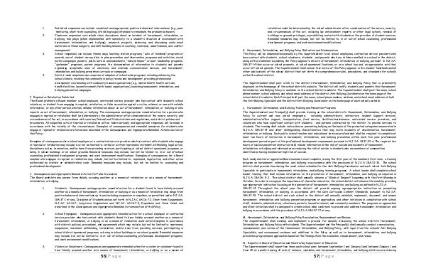 Each newly elected or appointed Board members must complete, during the first year of the member’ s first term, a training program on harassment, intimidation, and bullying in accordance with the provisions of N. J. S. A. 18A: 12-33. The school district shall provide time during the usual school schedule for the Anti-Bullying Coordinator and each school Anti-Bullying Specialist to participate in harassment, intimidation, and bullying training programs. A school leader shall complete school leader training that shall include information on the prevention of harassment, intimidation, and bullying as required in N. J. S. A. 18A: 26- 8.2. The school district shall annually observe a“ Week of Respect” beginning with the first Monday in October. In order to recognize the importance of character education, the school district will observe the week by providing age-appropriate instruction focusing on the prevention of harassment, intimidation, and bullying as defined in N. J. S. A. 18A: 37-14. Throughout the school year the district will provide ongoing age-appropriate instruction on preventing harassment, intimidation, or bullying, in accordance with the Core Curriculum Content Standards, pursuant to N. J. S. A. 18A: 37-29. The school district and each school in the district will annually establish, implement, document, and assess harassment, intimidation, and bullying prevention programs or approaches, and other initiatives in consultation with school staff, students, administrators, volunteers, parents, law enforcement, and community members. The programs or approaches and other initiatives shall be designed to create school-wide conditions to prevent and address harassment, intimidation, and bullying in accordance with the provisions of N. J. S. A. 18A: 37-17 et seq.