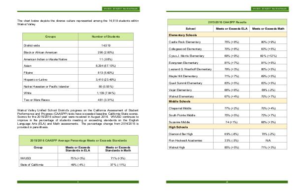 Walnut Valley Unified School District’ s progress on the California Assessment of Student Performance and Progress( CAASPP) tests have exceeded baseline California State scores. Scores for the 2015 / 2016 school year were received in August 2016. WVUSD continues to improve in the percentage of students meeting or exceeding standards on the English Language Arts( ELA) and Math assessments. The percentage change from 2014 / 2015 is provided in parenthesis.