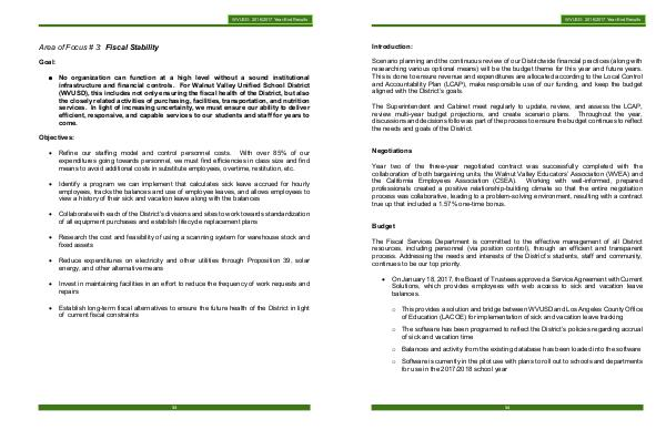 Year two of the three-year negotiated contract was successfully completed with the collaboration of both bargaining units, the Walnut Valley Educators’ Association( WVEA) and the California Employees Association( CSEA). Working with well-informed, prepared professionals created a positive relationship-building climate so that the entire negotiation process was collaborative, leading to a problem-solving environment, resulting with a contract true up that included a 1.57 % one-time bonus.