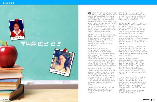 7 살의 용기 많았던 소녀 마이라는 어느덧 26 살의 숙녀가 됐으며,‘ 빛과 생명 교회’ 의 주일학교 교사로 헌신하며 살아 갑니다. 19 년의 시간 동안 하나님께서는 궁핍한 가정의 한 소녀의 삶에 찾아 오셔서 그녀를 사랑으로 채워주시고 이제는 그 무한한 사랑을 다른 이들에게도 전하는 삶을 살 수 있도록 인도해 주셨습니다. 마이라는 하나님을 통해‘ 행복’ 을 만났으며 그‘ 행복’ 속에 살고 있습니다. www. coj. org 15