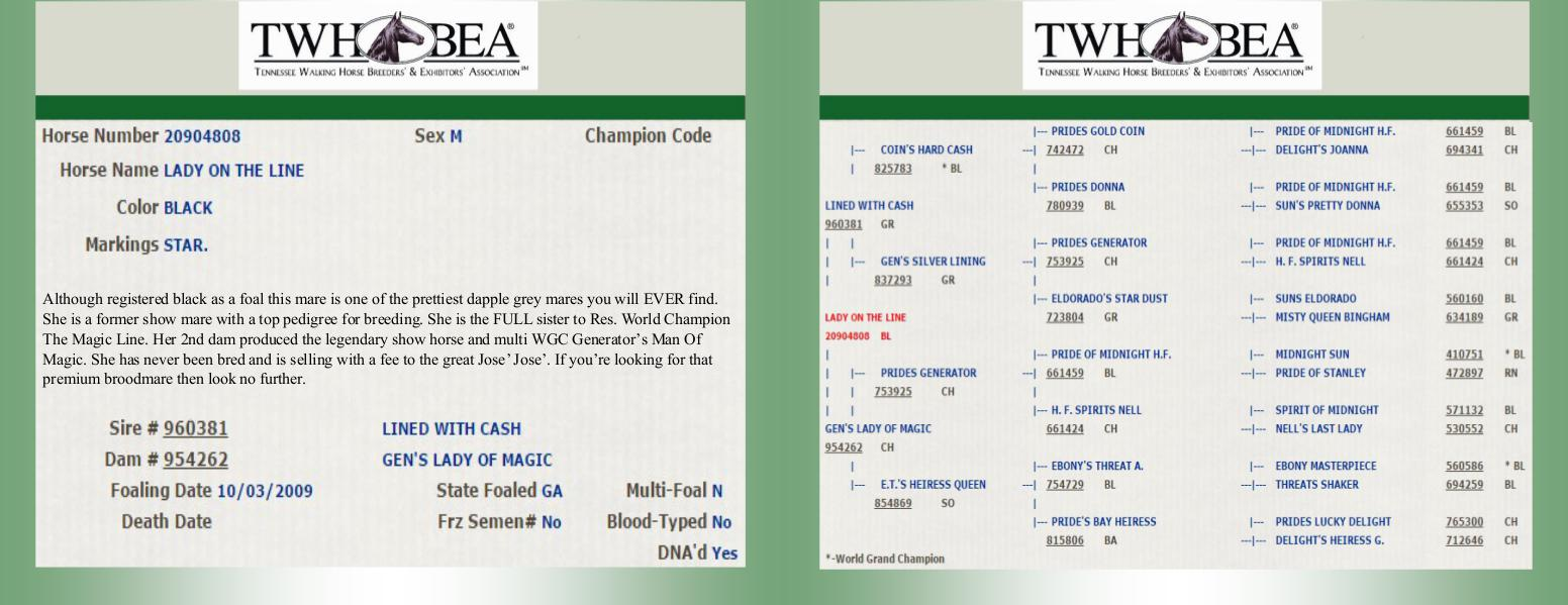 The Magic Line. Her 2nd dam produced the legendary show horse and multi WGC Generator’s Man Of