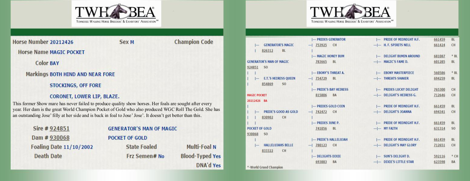 year. Her dam is the great World Champion Pocket of Gold who also produced WGC Roll The Gold. She has
