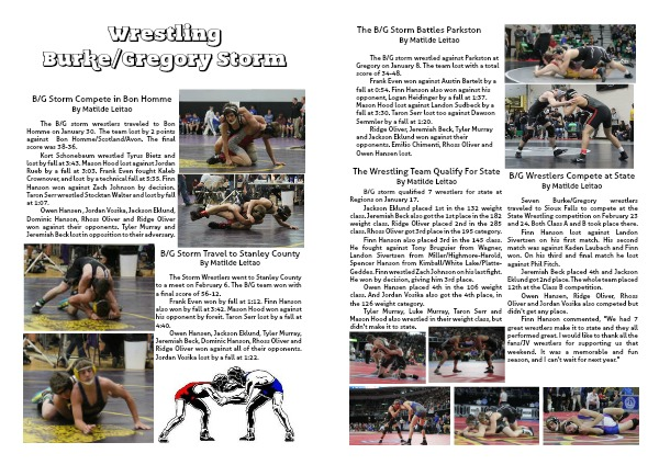 The B/G storm wrestlers traveled to Bon Homme on January 30. The team lost by 2 points against Bon Homme/Scotland/Avon. The final score was 38-36.