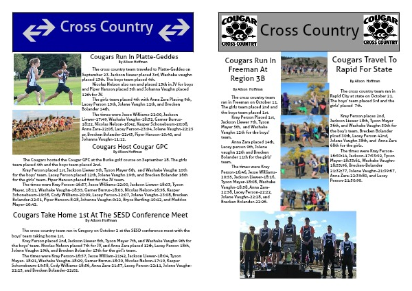 The cross country team ran in Rapid City at state on October 21. The boys' team placed 3rd and the girls' placed 7th.